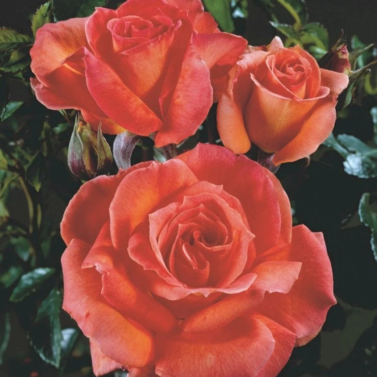 Orange til grenadinefarvet. Stor, velformet fyldt blomst med kraftig og dejlig, parfumeret duft. 25-40 kronblade. Op til 10 cm i diameter.