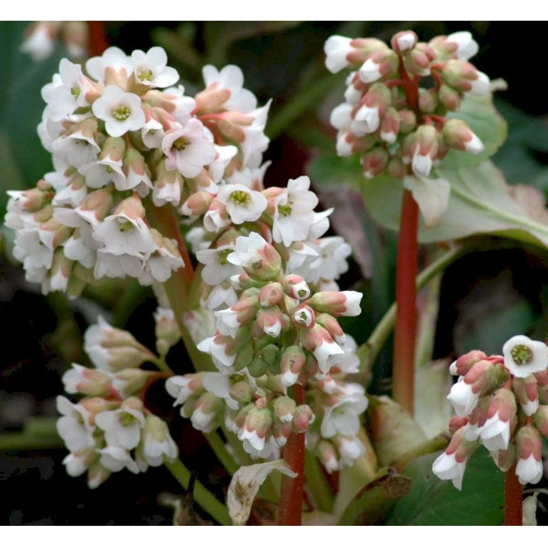 April – maj. Klokkeformede hvide til lysrosa blomster som sidder mange samme på tykke stilke over de læderagtige blade.