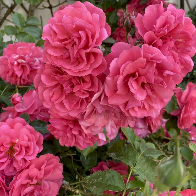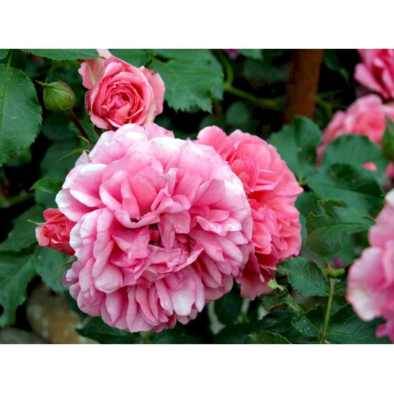 Ren og klar rosa. Stærkt fyldte blomster med let og behagelig duft. Mere end 40 kronblade. 10-15 cm i diameter.
